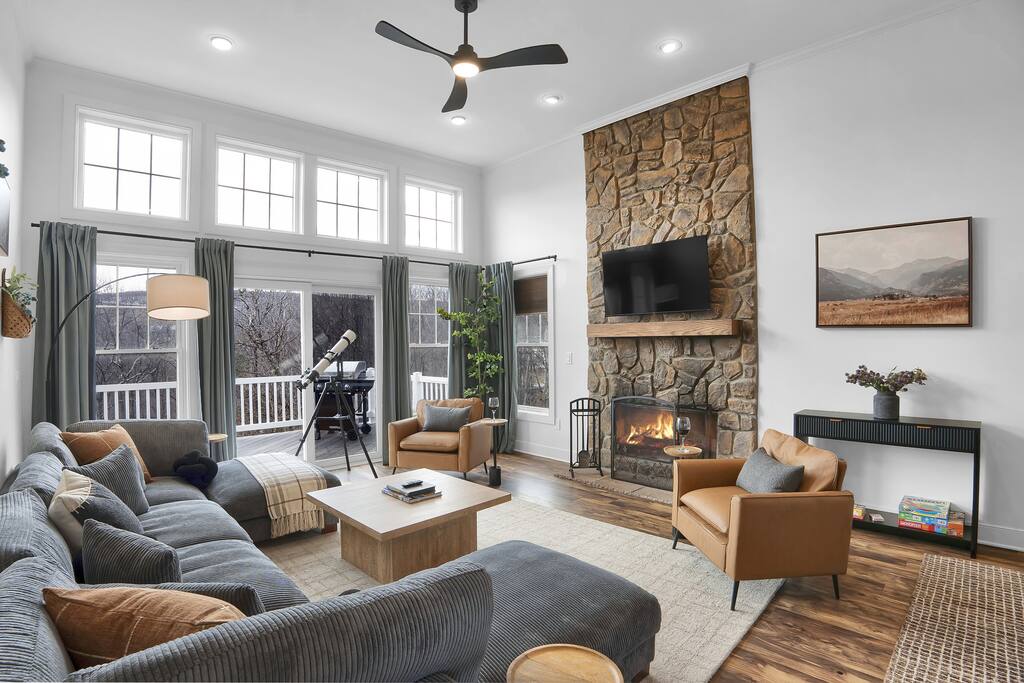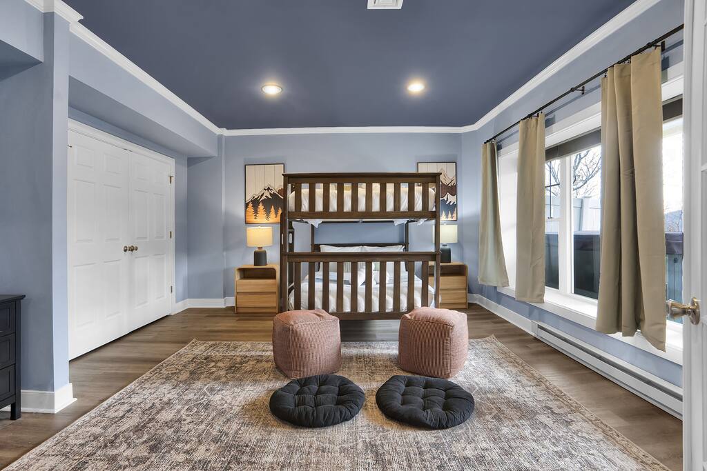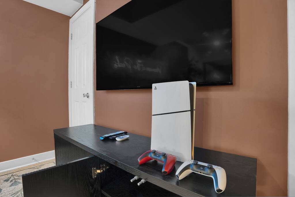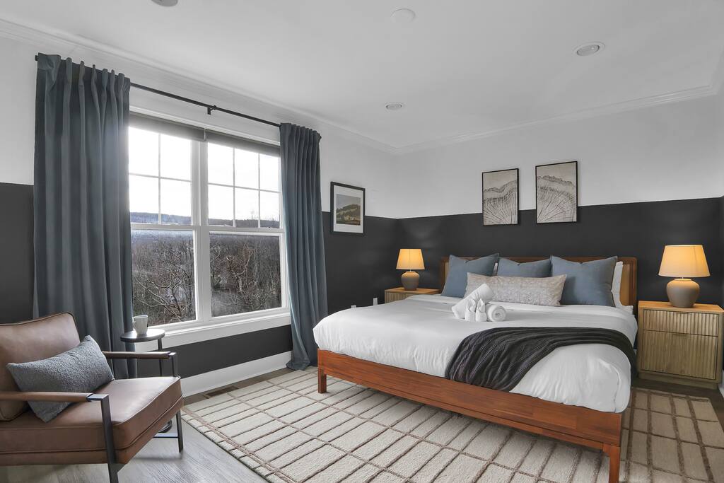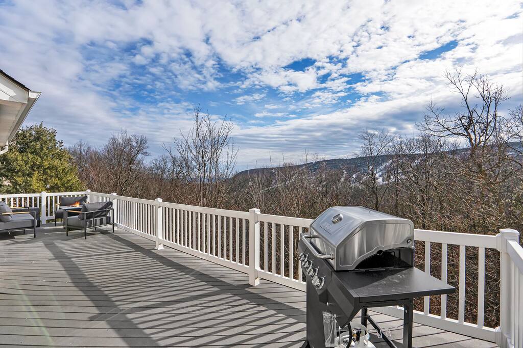 Sleeps 12 - 5 Bedrooms (4 King, 1 Full Bunk), 4 Full Bathrooms. Inside Space: - Master Bedroom: King Bed, Full Ensuite Bathroom with double vanity, Desk Area, Mountain Views, Deck Access, TV - Bedrooms 2 & 3: King Bed, TV - Bedroom 4: King, Views of Camelback Ski Area - Bedroom 5: Full Bunk, TV, Large play area - Living Room: Large Sofa, Deck Access, Board Games - 3 Full Bathrooms, one on each level - Dining Area with seating for 8 Guests - Spacious Kitchen: Breakfast table, coffee maker Outdoor Space: Offers mountain & sunset/night skiing views of Camelback resort. Amenities include: - Top Deck: Fire pit with seating, Telescope, Gas Grill - Lower Level: Private Hot Tub with mountain views Fast & Reliable Wi-Fi: - Fast speeds for streaming/business Located close to Camelback Resort, Tannersville & Local Amenities, Highlights: - Camelback Ski Resort: 3 min drive - Camelback Snow Tubing: 5 min drive - Aquatopia Indoor Waterpark: 6 min drive - Barley Creek Brewery: 7 min drive - Blue Ridge Winery Tasting Room: 9 min drive The House: Private driveway for 4 cars. Smart keypad on the front door for house access. Main Floor: Enter the home into a beautifully appointed, open plan Living Room, Dining area and fully equipped Kitchen with breakfast table. There is plenty space of space for large groups to gather under the vaulted ceiling while enjoying the stunning views from the window out across the mountains. And when it gets dark trace the night skiing runs or use the telescope to view the stars. Or end the day relaxing in front of the fire by night, while watching a favorite show/movie on the Smart TV. The Master Suite comprises a King bed, full ensuite bathroom with double vanity, shower and bathtub plus a walk in closet. All situated privately on the main level overlooking the mountains, with its own access to the deck and Smart TV. To the front of the house is another King bedroom with Smart TV. A separate full bathroom complex the first level. Upper Floor: Consists of a Full bath between 2 King bedrooms, one facing the front of the property and a larger room facing the rear with the best views of the slopes and night skiing. Lower Floor: A large bedroom with Full bunks, ample space to play and large windows overlooking the rear completes the bedrooms. There is a large full bathroom plus separate large laundry room with modern washer/dryer, drying rack and folding table available. The rest of the level is full of fun for the whole family. Step into a large movie area with ample seating along with a PS5 and popcorn machine for the kids to enjoy. Additionally there is a retro skeeball machine and arcade game machine for kids and adults alike to enjoy. Or sit in front of the mural and battle at chess, or take one of the magnetic games off the wall and play checkers, Tic Tac Toe or backgammon. A new modern pool table can be enjoyed right next to the themed bar 'Poco Pour House'. Outside: Relax after a day on the slopes or enjoying the local attractions, swapping stories with loved ones in the seating area with the fire pit providing warmth in front of you, or bring our the telescope and sit on the cushions while staring up at the stars. If you need additional relaxation, head to the lower level to enjoy privately situated the Hot Tub, still overlooking the mountains. There is a new gas grill available for the chef in the house. With it's unique, luxurious and amenity packed design, Silver Birch Summit is the perfect home to enjoy a great few days in the mountains so close too all the camelback/Tannersville area has to offer!